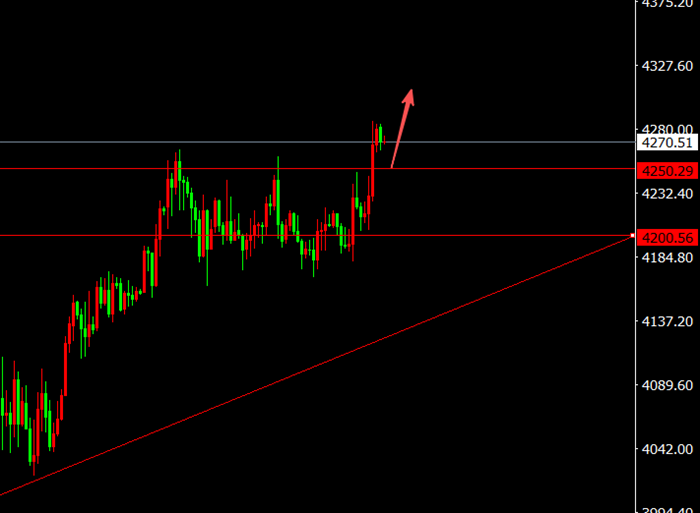 周四随着美联储连续第三次降息25个基点 ,黄金价格强势反弹,现货黄金上涨1.2%,触及每盎司4285.75美元的逾一个月高点 ,这一轮贵金属行情的爆发,不仅源于美元走软和通胀压力持续,还受到了即将公布的非农就业报告以及全球地缘政治动荡的推动。技术面金价符合预期再次走强突破 ,前期压制转为支撑,日内回撤4250附近可尝试继续看涨 。